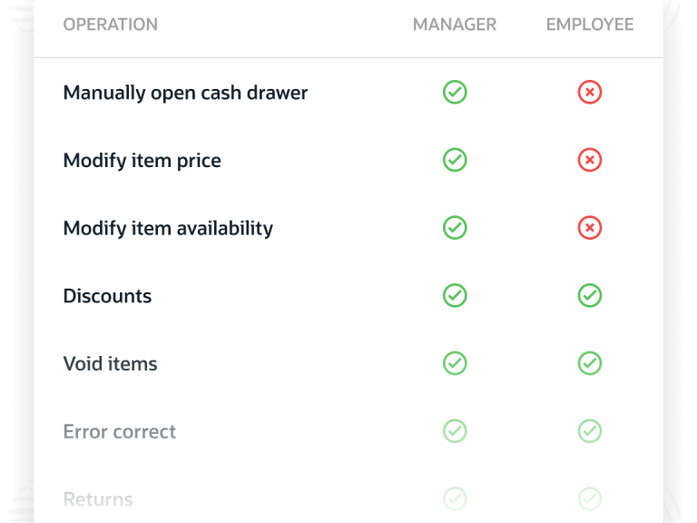 Easily differentiate between your employees’ access to various POS operations.